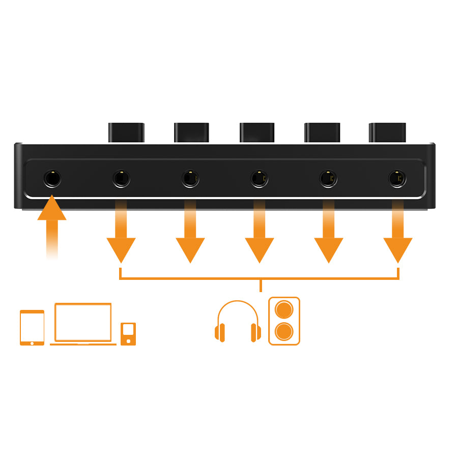 It splits audio signal into 5 channels for sharing music between up to 5 speakers or headphones simultaneously.