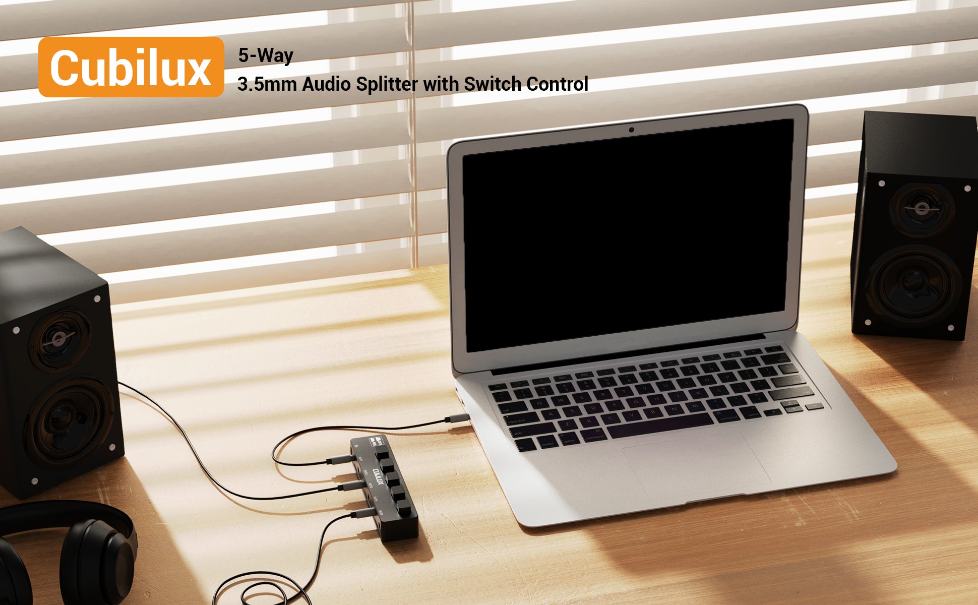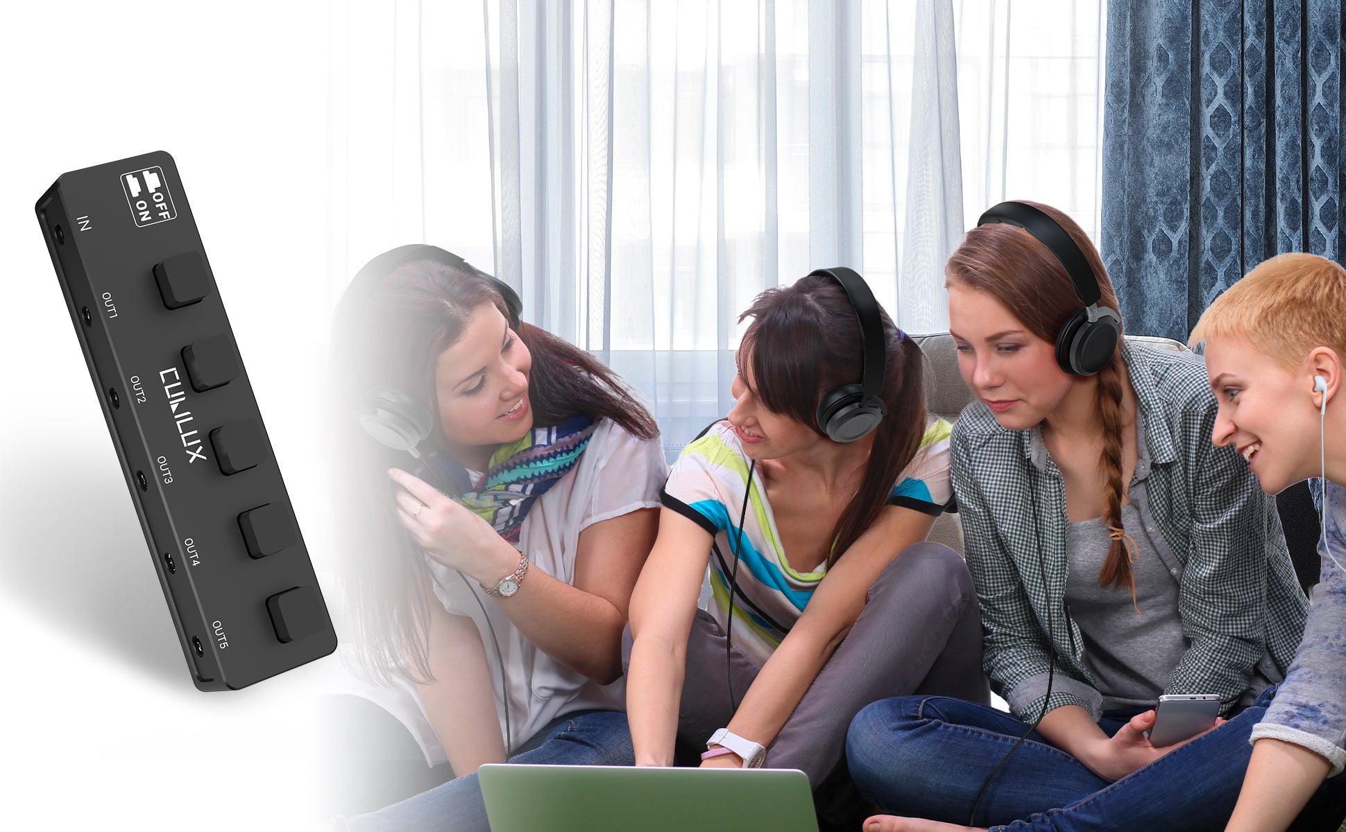 - [5 Ports Headphone Splitter]- Cubilux aux adapter splits audio into 5 x 3.5mm auxiliary ports, letting you to hook up multiple headphones or speaker systems to play music at the same time or easily share music with up to 5 friends.