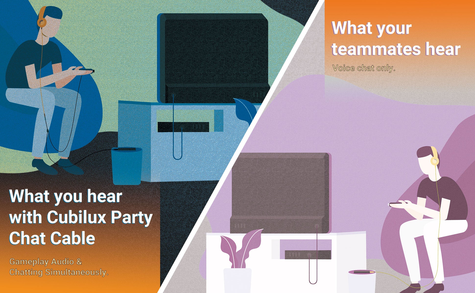- What you hear with Cubilux Party Chat Cable: Gaming audio from computer/gaming console and talking from phone at the same time.