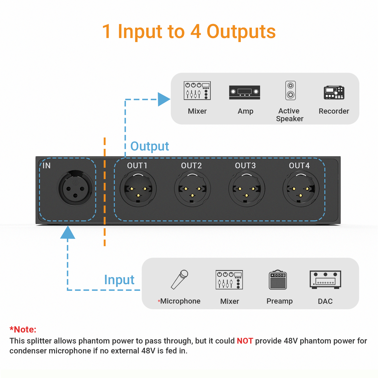 - 【1 In 4 Out XLR Mono Audio Splitter】The Cubilux 4-way XLR splitter distributes one balanced mono input to four amps, speakers, or monitors — ideal for stage, studio, or PA setups.