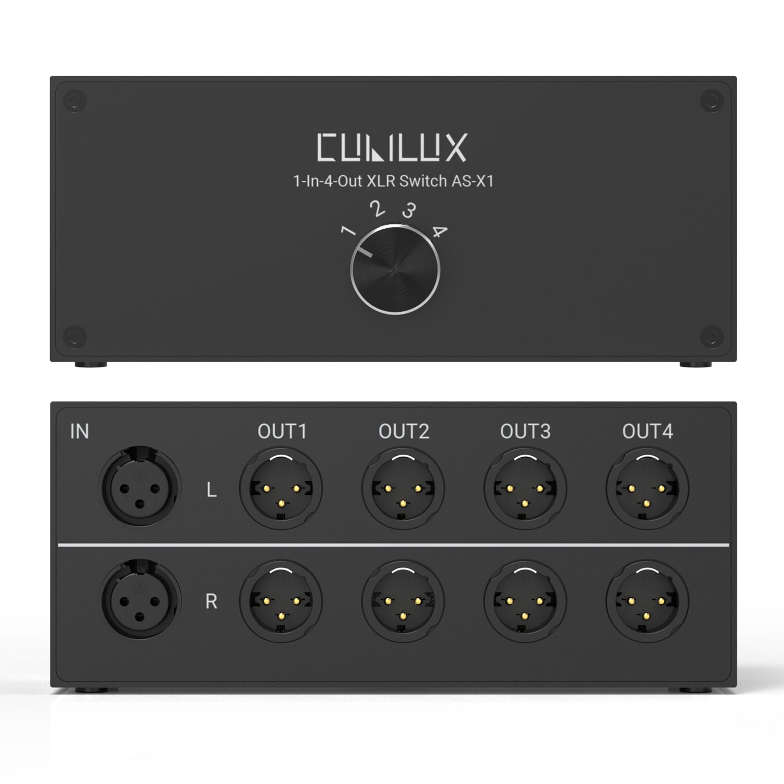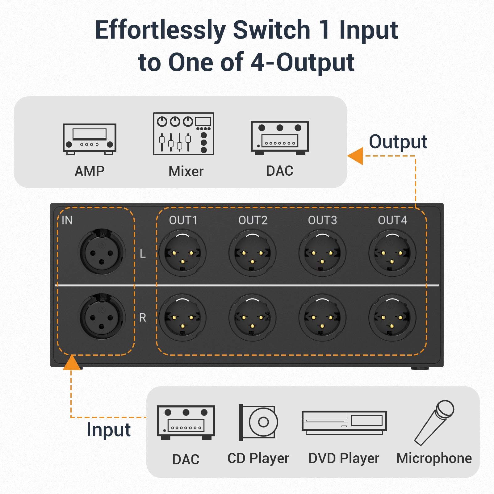 - [1-In-4-Out XLR Switcher] - Cubilux AS-X1 XLR Switch Box allows you to route your microphones, mixers, DACs, DVD/CD players, etc, into up to 4 different amplifiers, speakers, monitors, etc, for home studio setup, audio test or more.