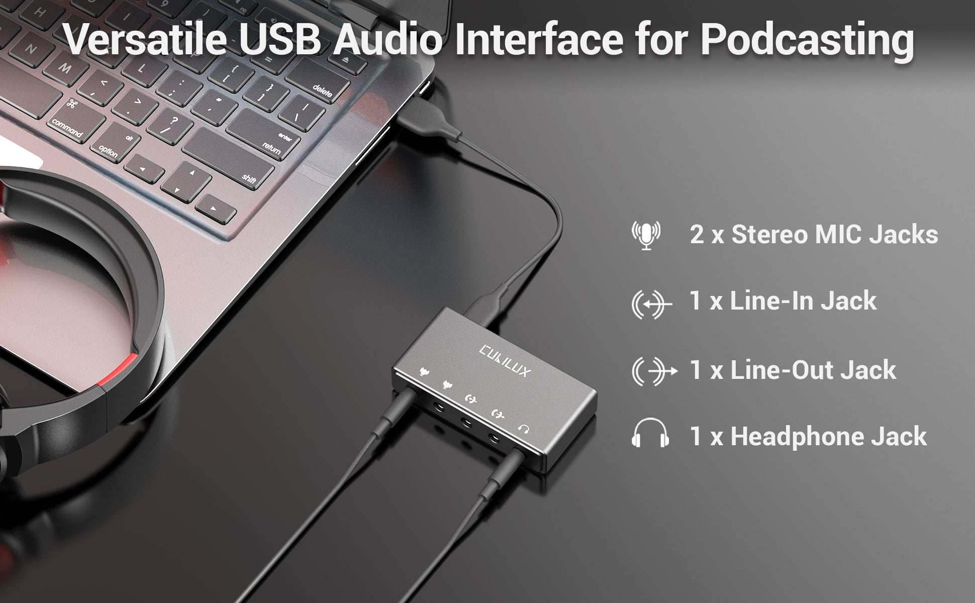 - [5-In-1 Audio Hub] - Cubilux CB5 USB Audio Interface converts the USB port of your laptop into 2 stereo microphone jacks, 1 line-in jack, 1 line-out jack, and 1 headphone jack, letting you conveniently connect microphones, instruments, and headphones or speakers as needed. Please note that the line-out jack and the audio output jack cannot be used simultaneously.