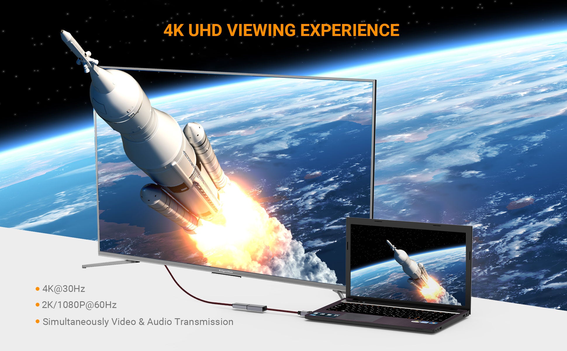 Support 4K(4096x2160) at 30Hz refresh rate, 2K(2560*1440) at 60Hz and 1080P(1920*1080) at 60Hz and allows simultaneously transmission of Video and Audio signal.