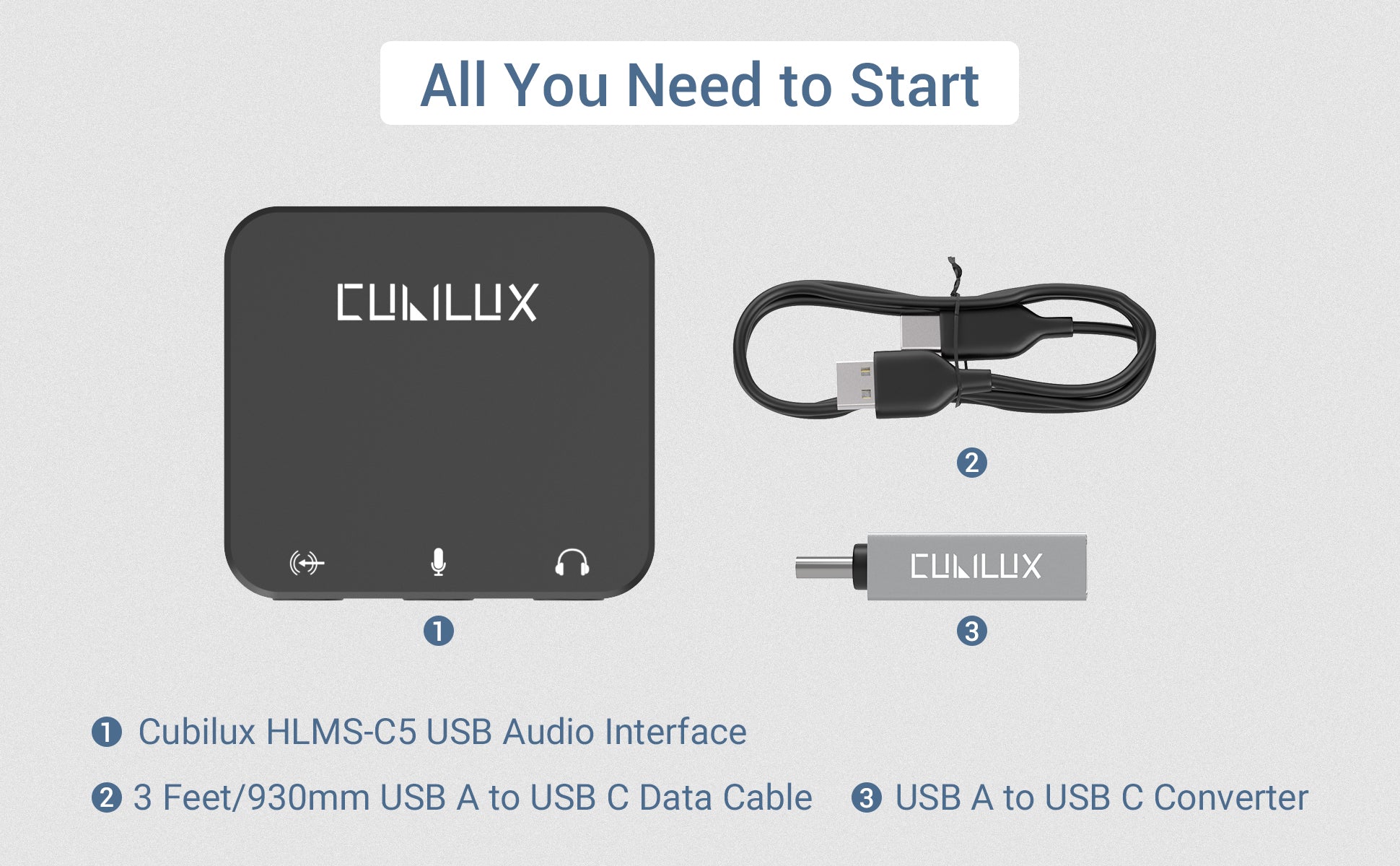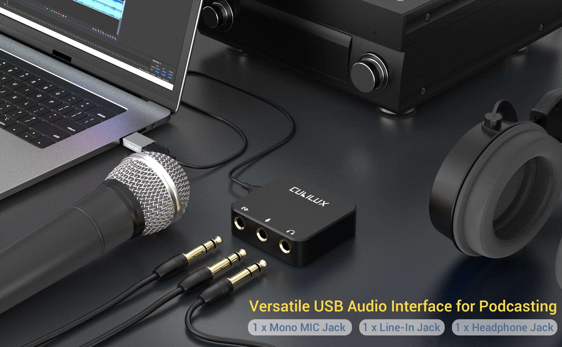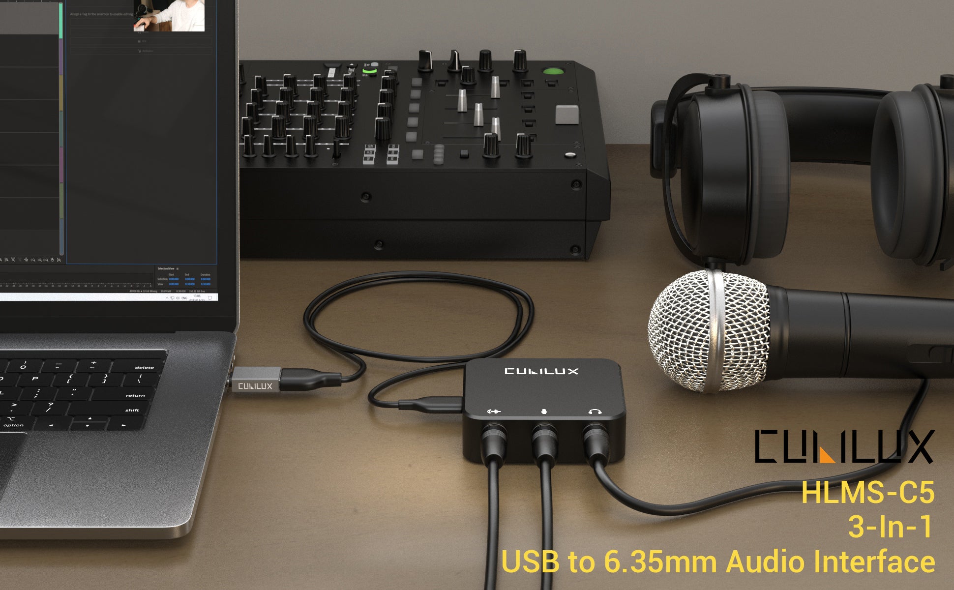 - [3-In-1 1/4-In Audio HUB] - Cubilux HLMS-C5 turns the USB port into a stereo line-in jack, a mono MIC jack, and a headphone jack, enabling an efficient setup for podcasting, live streaming, vlogging, instrumental performances, music production, etc.