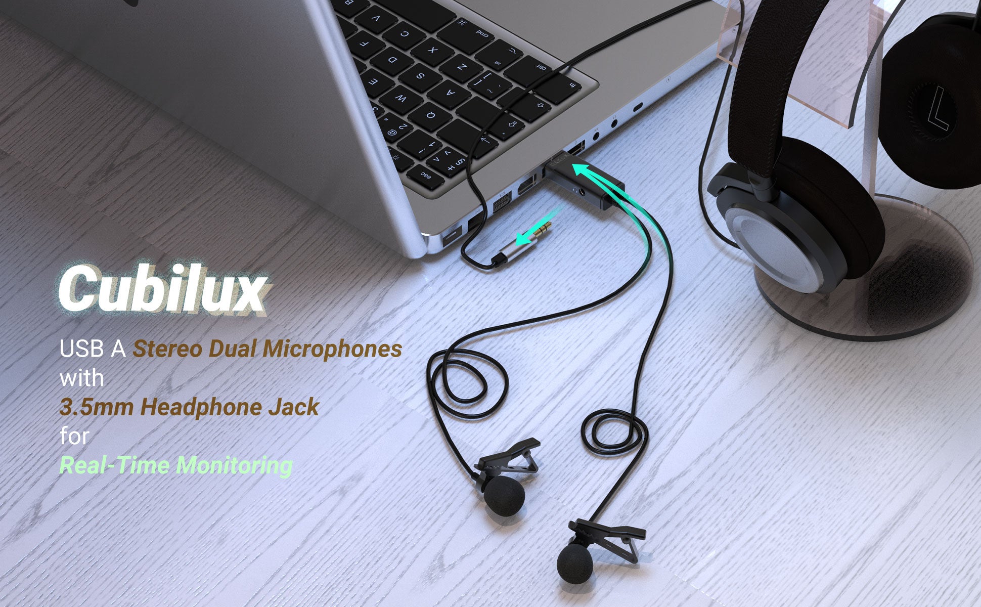 Cubilux USB A Dual Lapel Microphones with Monitoring Headphone Jack