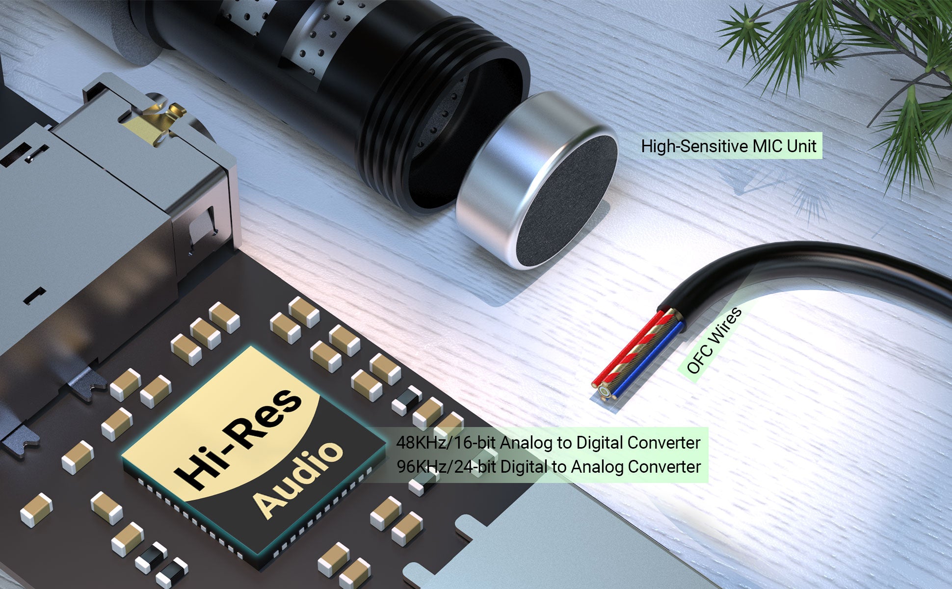 - ADC: Ensure studio grade professional recording up to 48KHz/16-bit and reduce static noise.