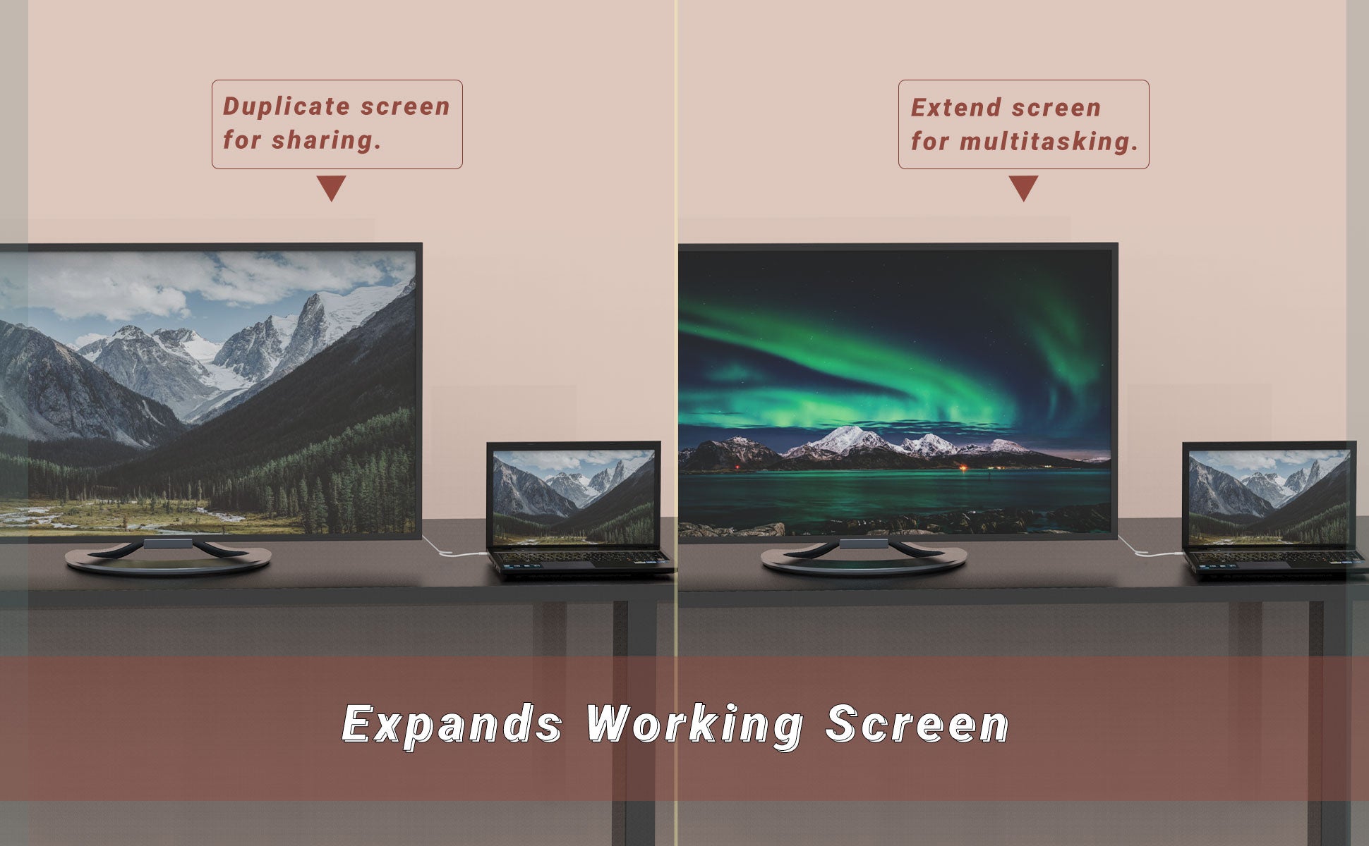 With simple setup, you can instantly duplicate your screen for sharing presentation or power point, or, you can extend your screen and achieve multitasking and improve working efficiency.
