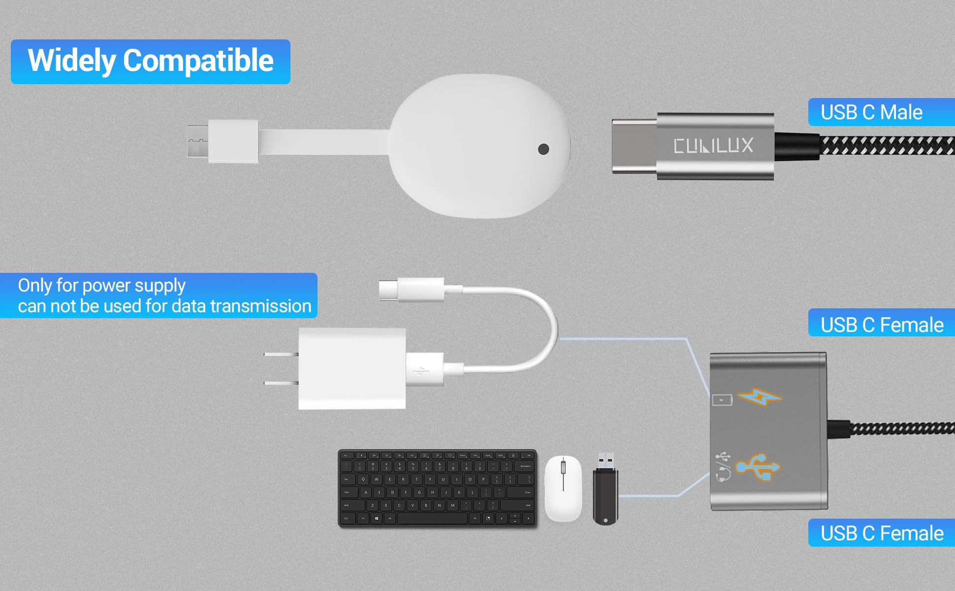 - [Designed for Chromecast]- This USB C to dual USB C splitter is specially designed for the Google Chromecast Gen 3 and is also compatible with most other USB C devices including smartphones, tablets, laptops, etc. Please check your device's specifications to ensure the compatibility.