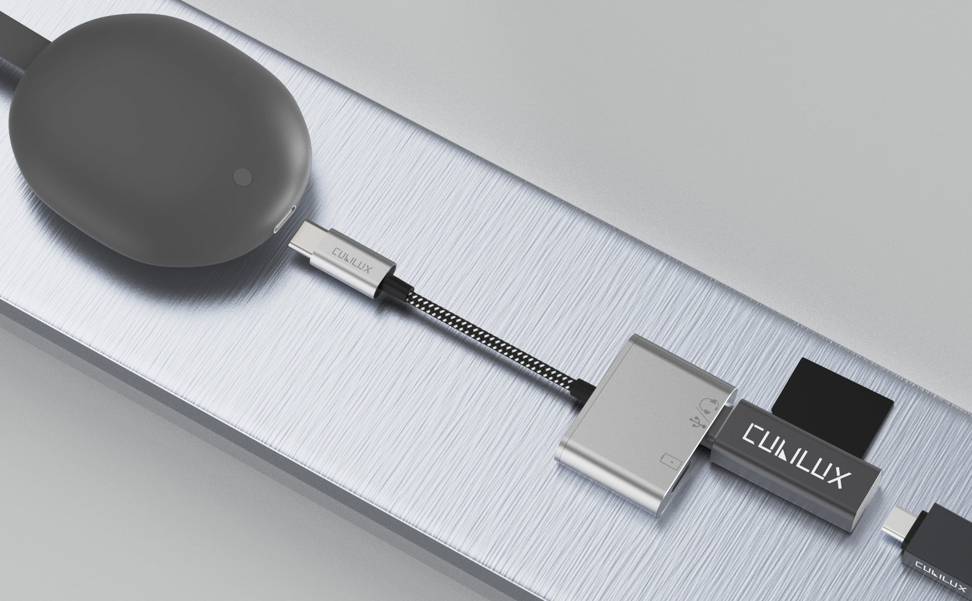 Cubilux USB C 2-in-1 Headphone Charger Adapter splits the USB C port into a charging-only port and a fully functional USB C port, which enables you to use flash drives and charge chromecast at the same time.