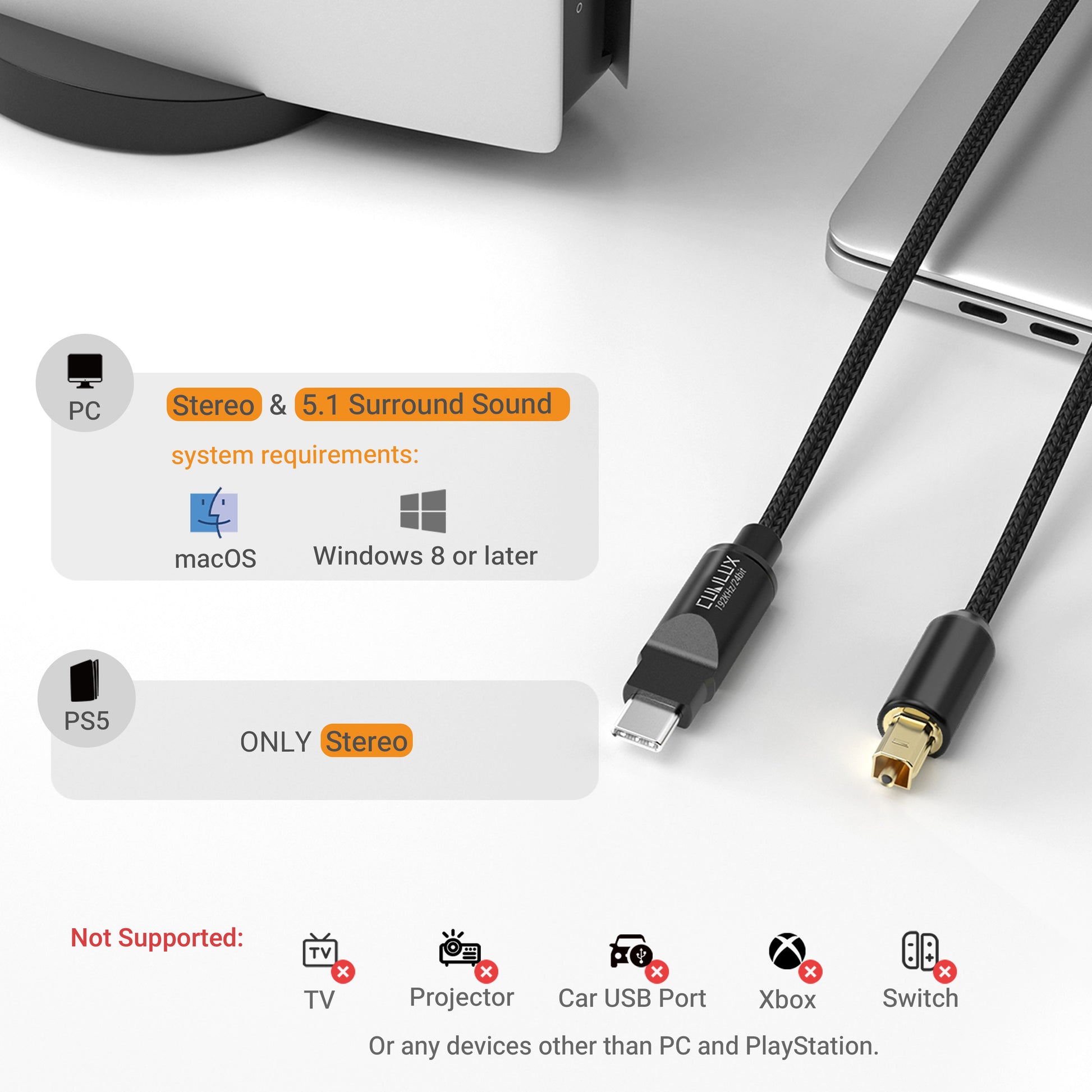 - [For Computer, PlayStation 5 ONLY] – This optical transmitter works exclusively with computers (supporting stereo and 5.1 surround) and PS5 (supporting stereo only). It does NOT work with TV, Xbox, Switch, projector, or any other non-computer USB devices.