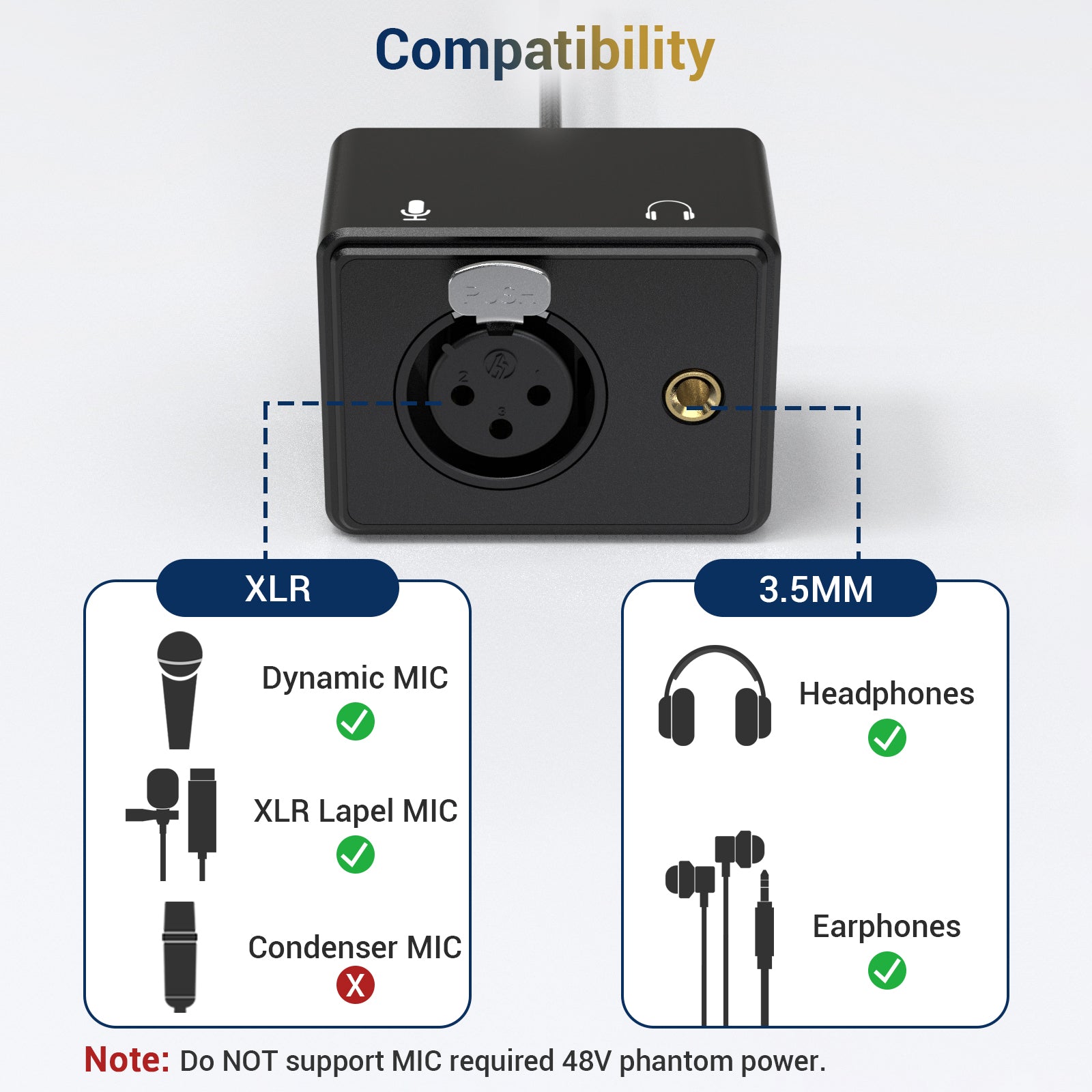 2. The Splitter does NOT support microphone that required 48V phantom power,ONLY for XLR dynamic microphone or XLR lapel microphone.